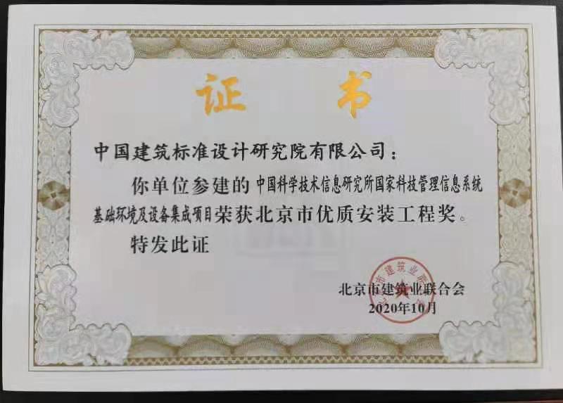 近日,由中国建筑标准设计研究院(以下简称“标准院”)参建的中国科学技术信息研究所国家科技管理系统基础环境及设备集成项目,荣获“北京市优质安装工程奖”。