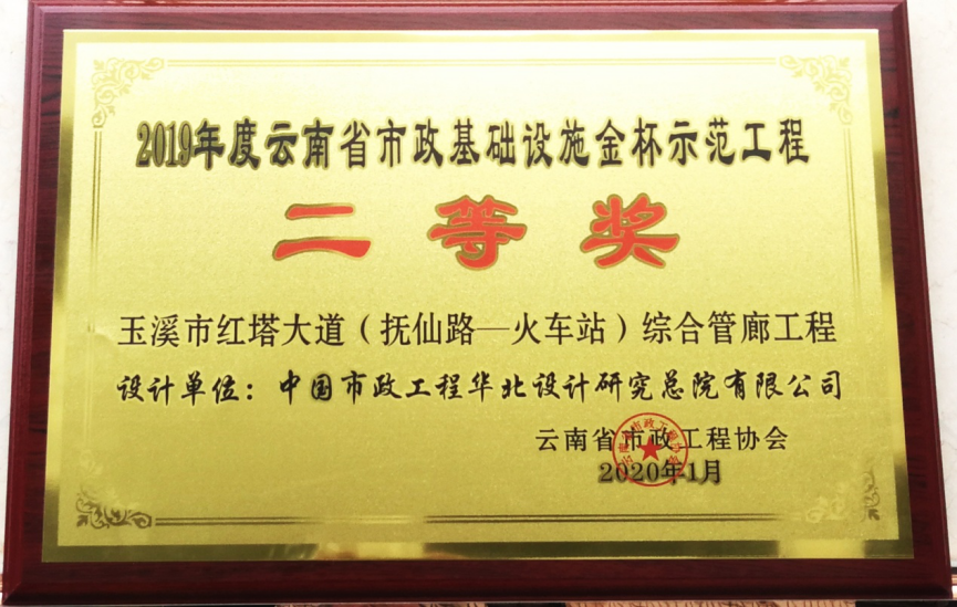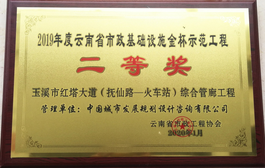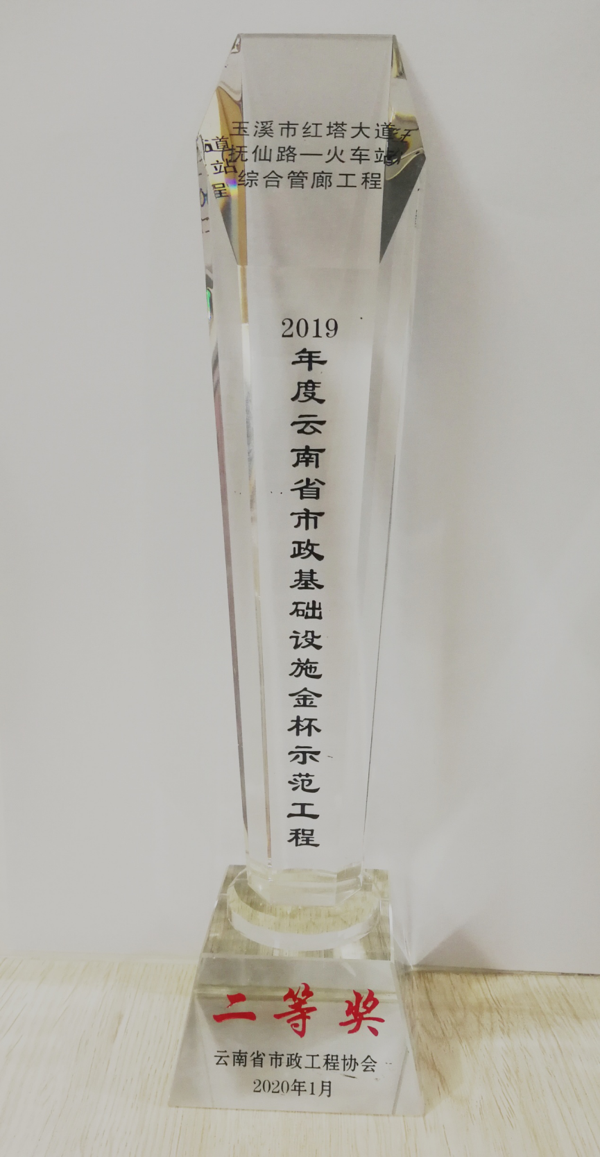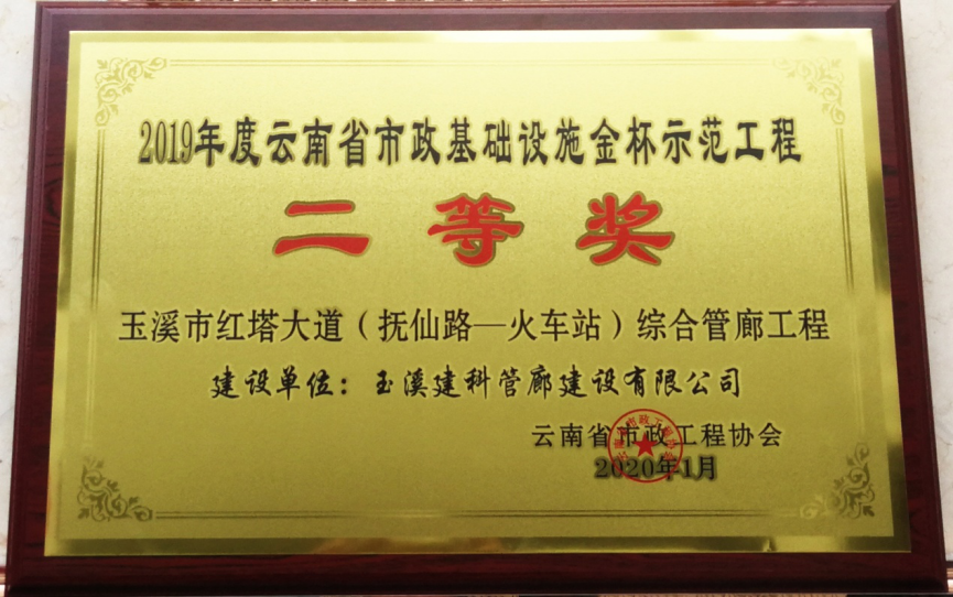 2020年12月18日,在云南省市政工程协会举行的2019年度云南省市政基础设施金杯示范工程评选颁奖仪式上,集团公司中标并实施的玉溪市红塔大道(抚仙路——火车站)综合管廊工程榜上有名,喜获2019年度云南省市政基础设施金杯示范工程二等奖。